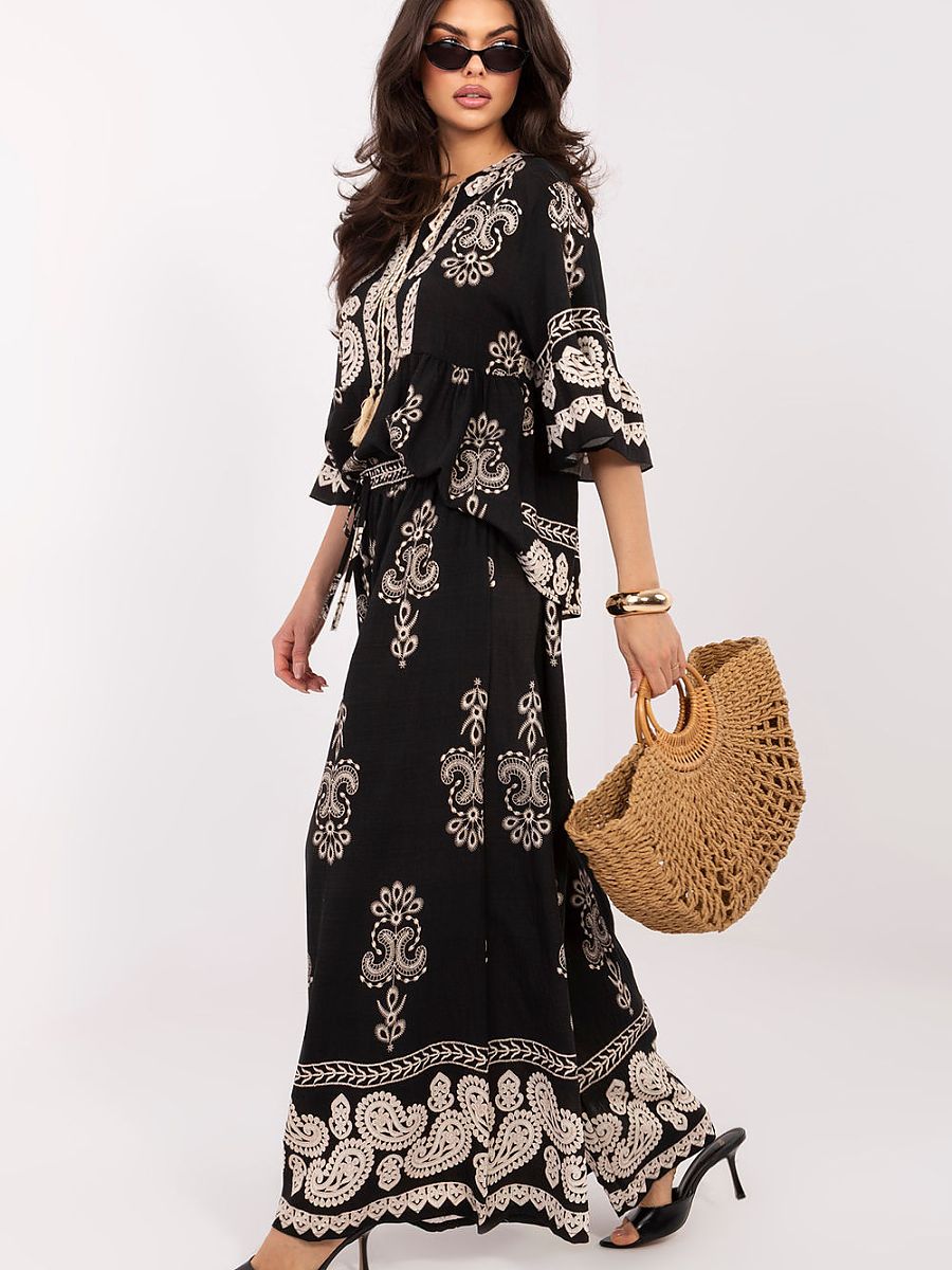 Women’s boho set is a light and stylish proposition perfect for everyday wear. The loose fit and trendy print give the whole a unique, artistic character that fits perfectly into casual, feminine stylizations. The set consists of a blouse and trousers made of a combination of viscose and polyamide, which guarantees breathability, lightness, and comfort. The 3/4 sleeve blouse has a round neckline with a tie, which adds subtle elegance and allows for delicate adjustment. The trousers with long legs were designed with comfort in mind, have a tie at the waist, which allows for a perfect fit to the silhouette. The loose cut ensures freedom of movement, and the whole creates a harmonious, stylish set for everyday wear. It is an excellent choice for women who value comfort, natural materials, and non-traditional, boho style.