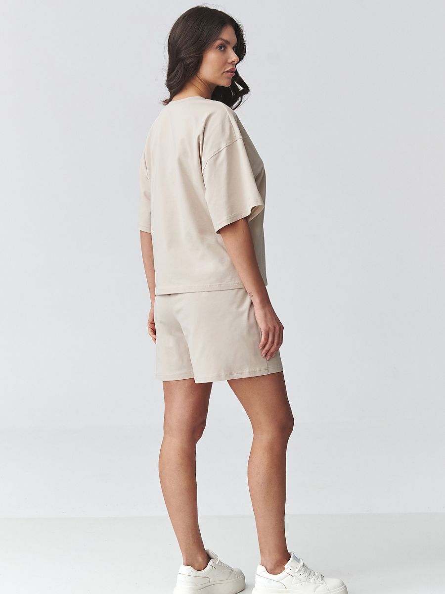 Stylish women’s set consisting of a loose blouse with short sleeves and comfortable shorts is an ideal proposition for women who appreciate comfort and a fashionable look. The smooth oversized blouse with a round neckline provides freedom of movement and fits perfectly on the silhouette, creating a modern, minimalist look. Women’s shorts with an elastic waist guarantee a perfect fit and comfort throughout the day. The loose cut and practical pockets increase the functionality of the set, making it a great choice for both everyday wear and active leisure. This sporty women’s set will work as a styling for a walk, shopping, trip or relaxation at home. Paired with sneakers, it creates a fashionable, urban outfit. Opt for a comfortable women’s set that combines comfort, versatility, and timeless style.
