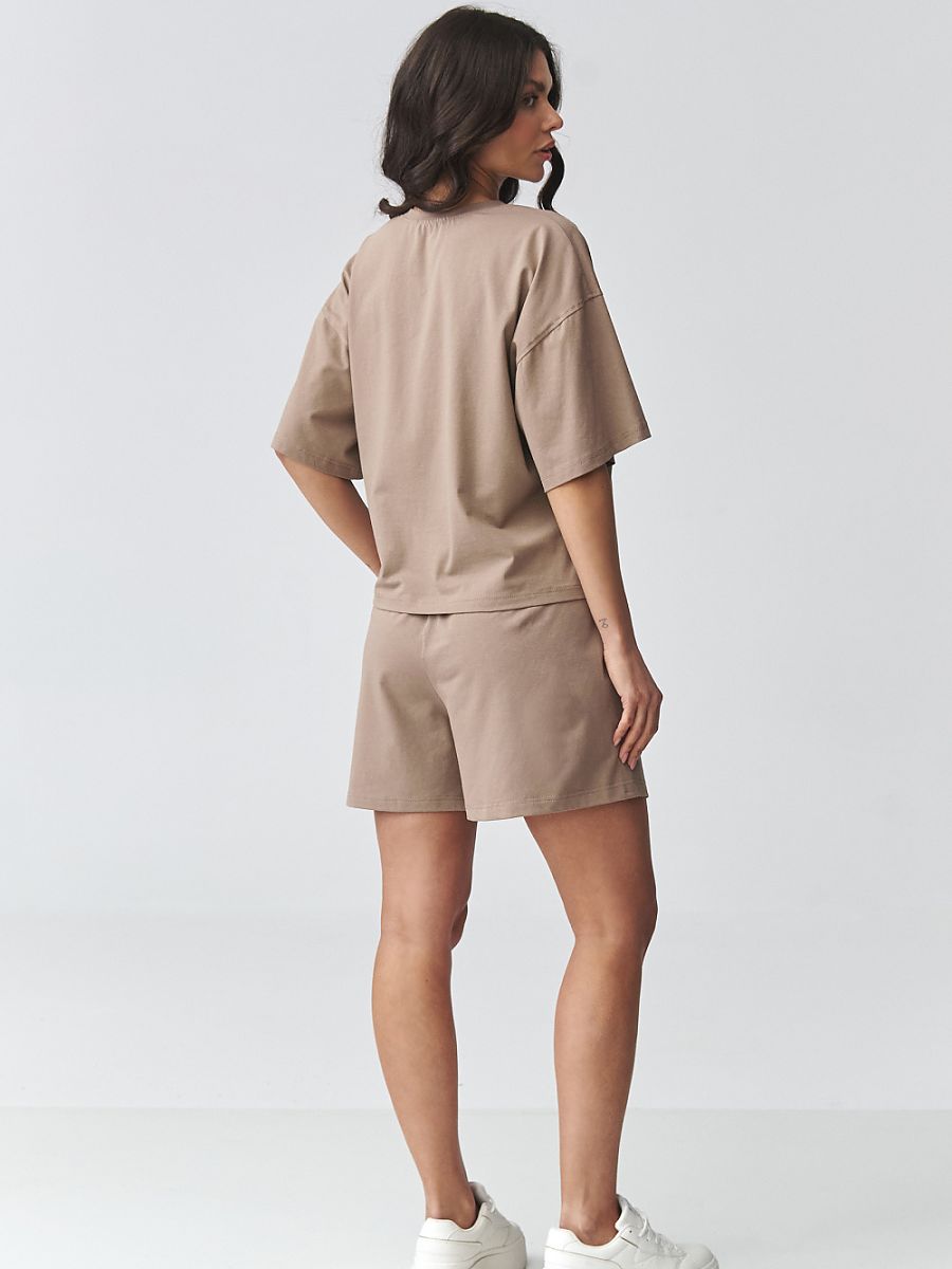 Stylish women’s set consisting of a loose blouse with short sleeves and comfortable shorts is the perfect choice for women who appreciate comfort and a trendy look. The smooth oversized blouse with a round neckline provides freedom of movement and fits perfectly on the silhouette, creating a modern, minimalist look. Women’s shorts with an elastic waist guarantee a perfect fit and comfort throughout the day. The loose fit and practical pockets increase the functionality of the set, making it a great choice for everyday wear and active leisure. This sporty women’s set will work as a styling for a walk, shopping, trip or relaxation at home. Combined with sneakers, it creates a trendy, urban outfit. Choose a comfortable women’s set that combines comfort, versatility, and timeless style.